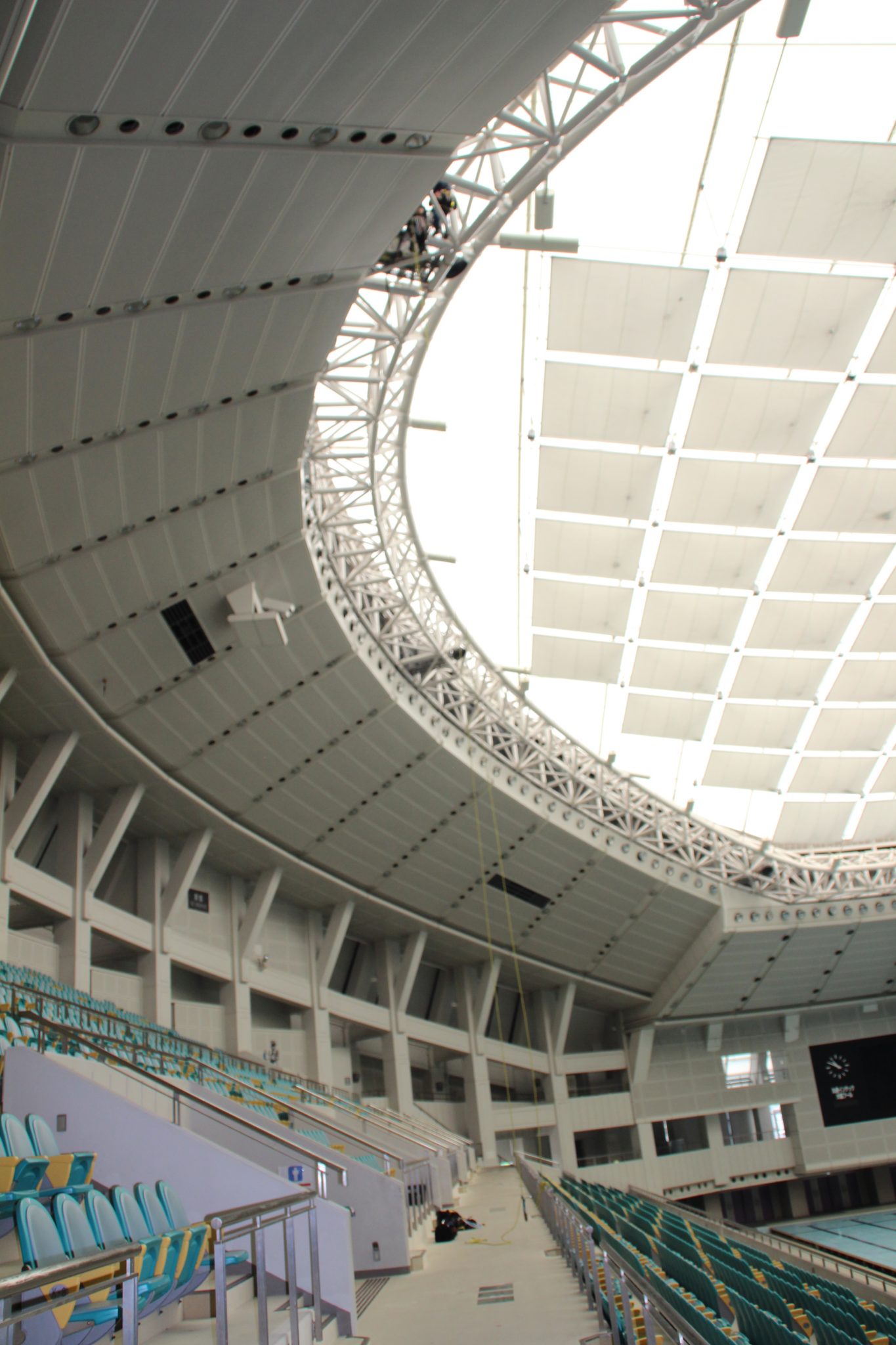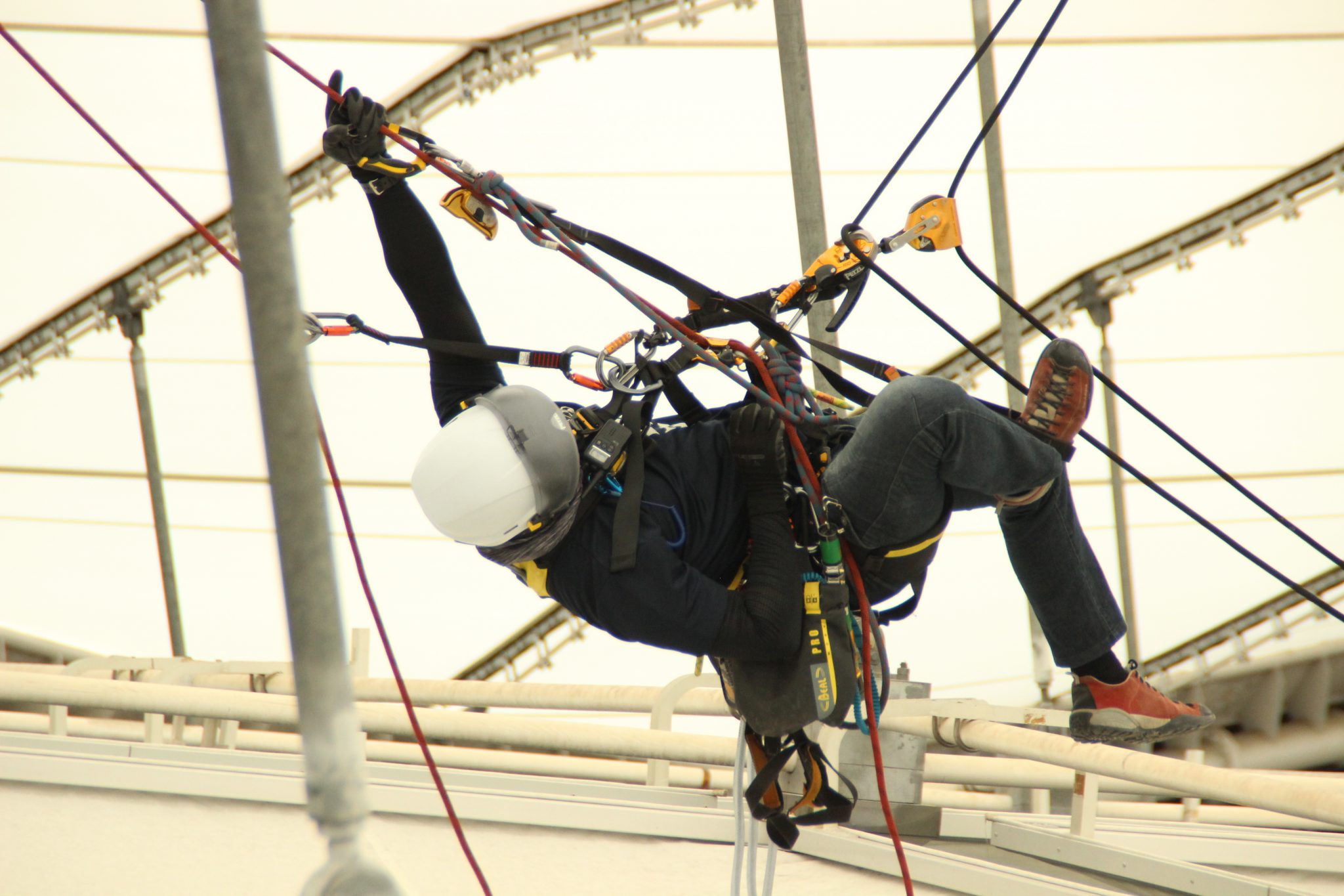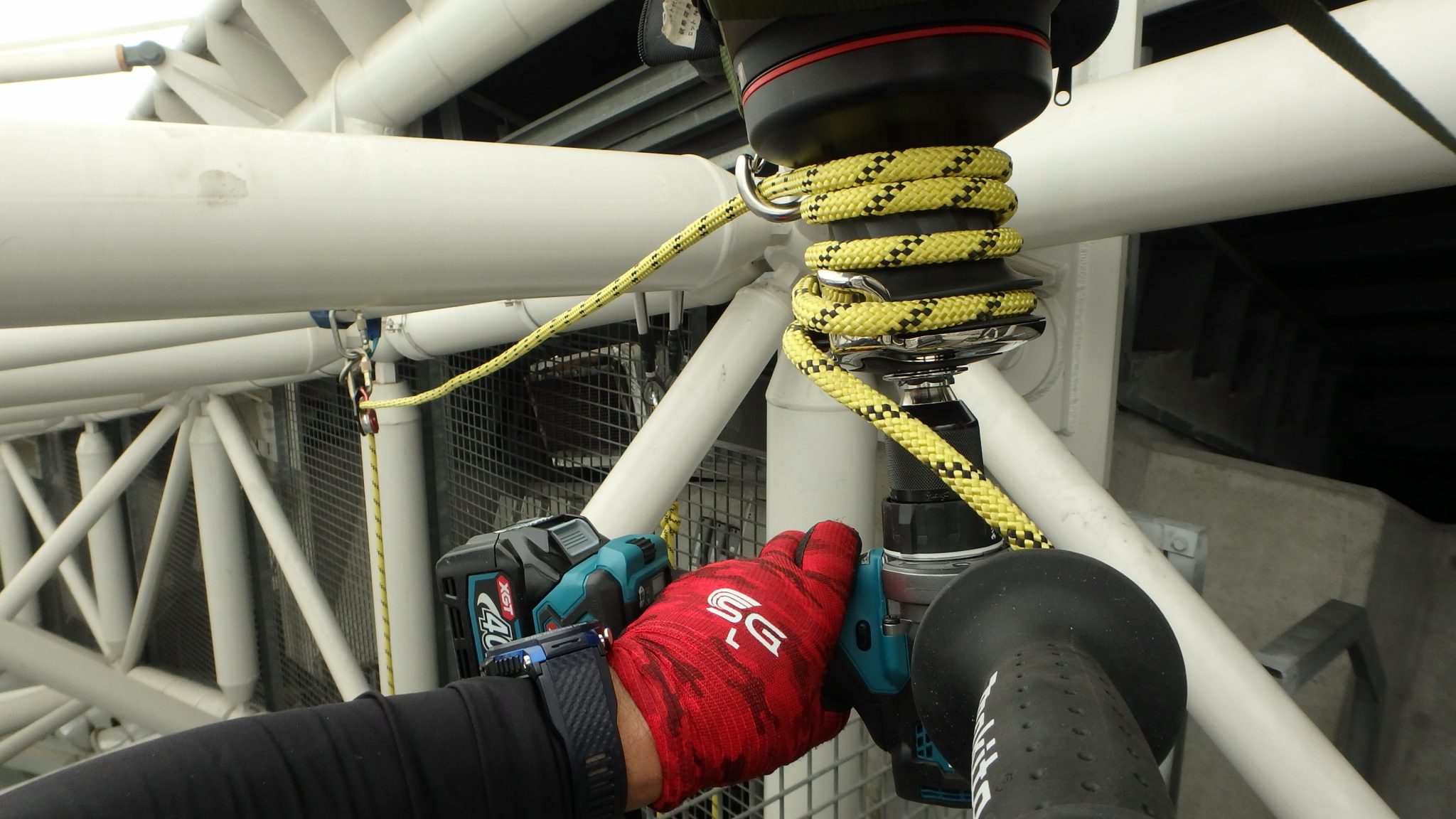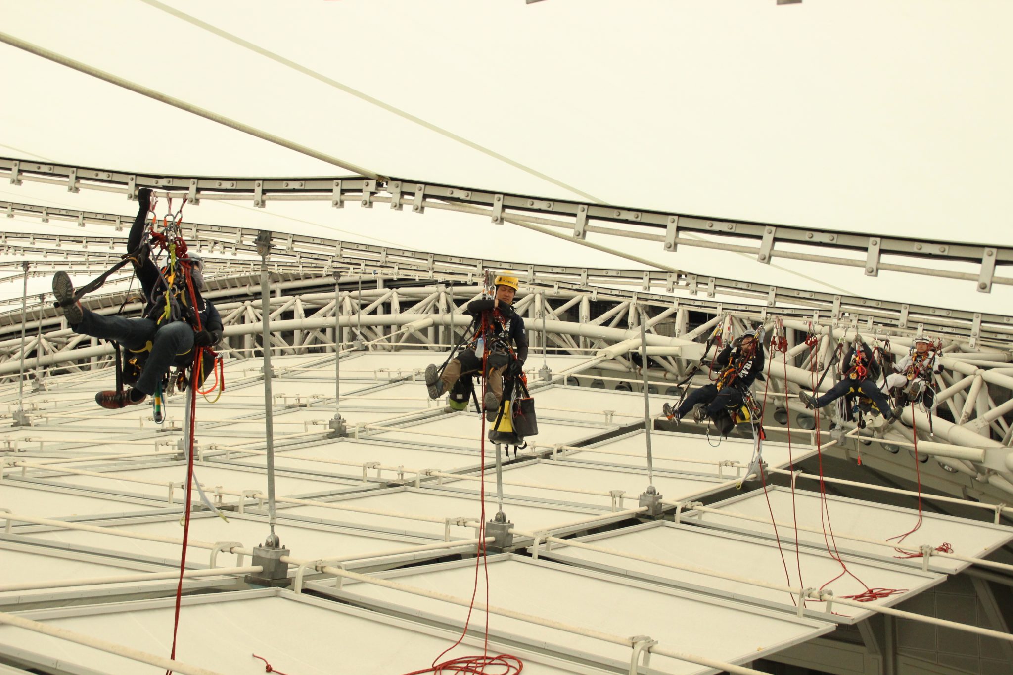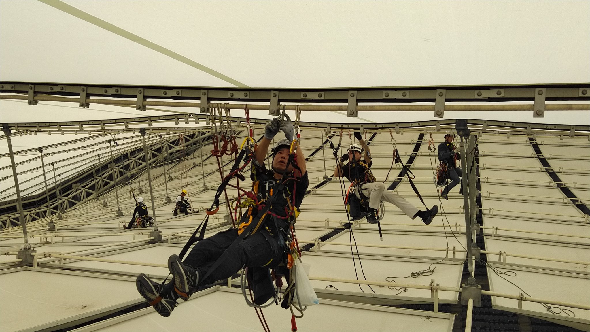 緩んだネジやボルトの点検・交換等、全てIRATAエイドクライミング工法で行っています。そろそろ天井部暑くなってきたので、水分補給が大切です。